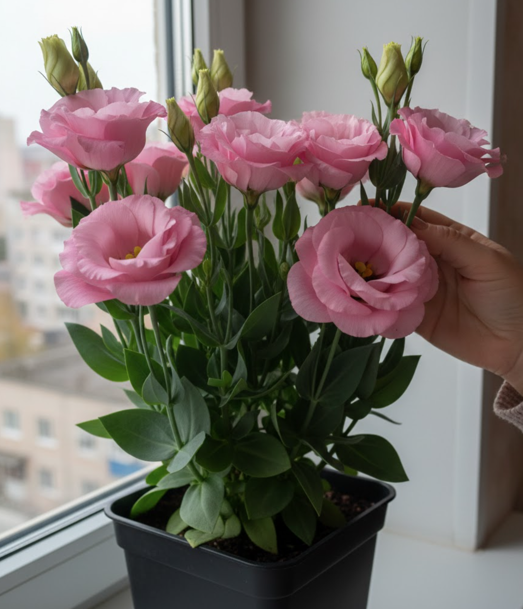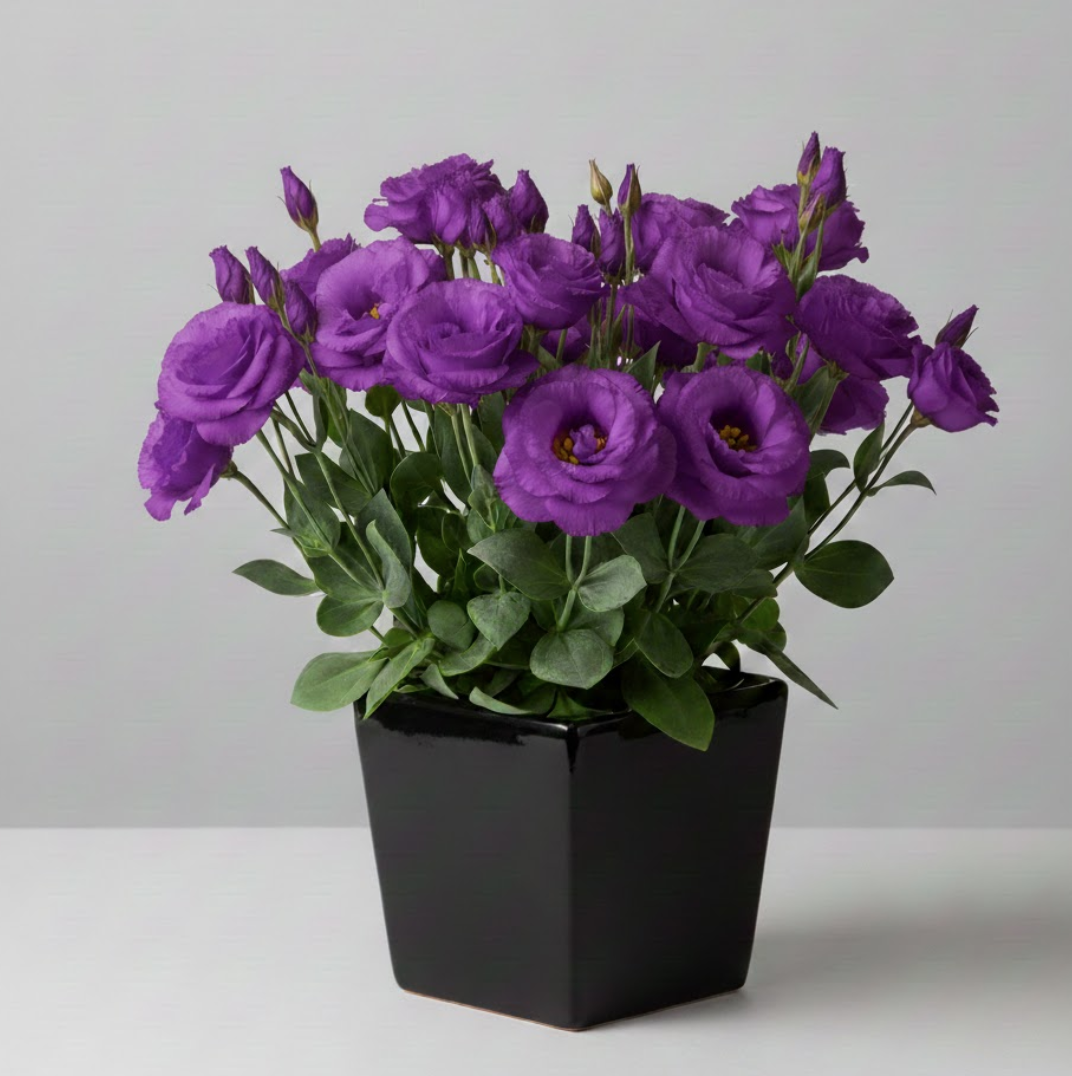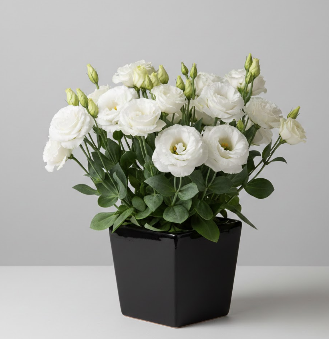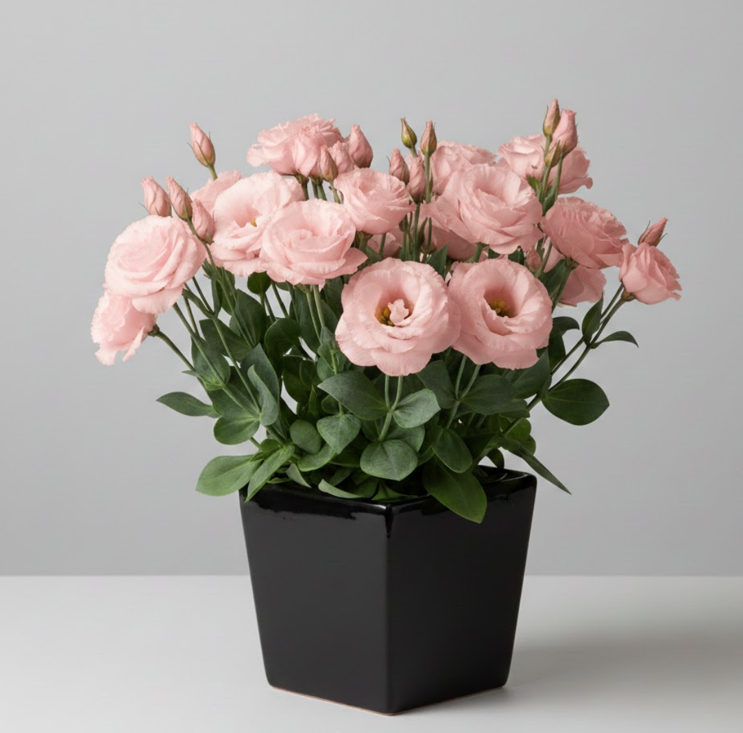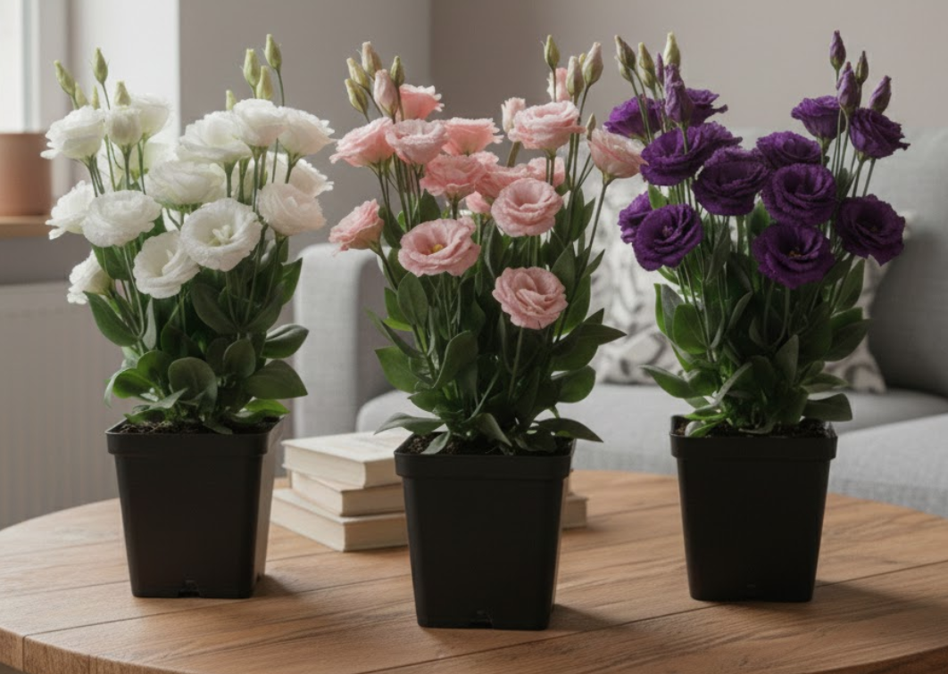 Лізіантус «Адалін» — це великі шовковисті квіти з багатошаровими пелюстками виглядають як з бутик-флористики. Кущ формується компактно та акуратно — приблизно 35–55 см заввишки, без хаотичного розростання. На піку цвітіння рослина може одночасно тримати 20–40+ бутонів, тому вигляд завжди об’ємний і святковий, навіть у звичайній квартирі.