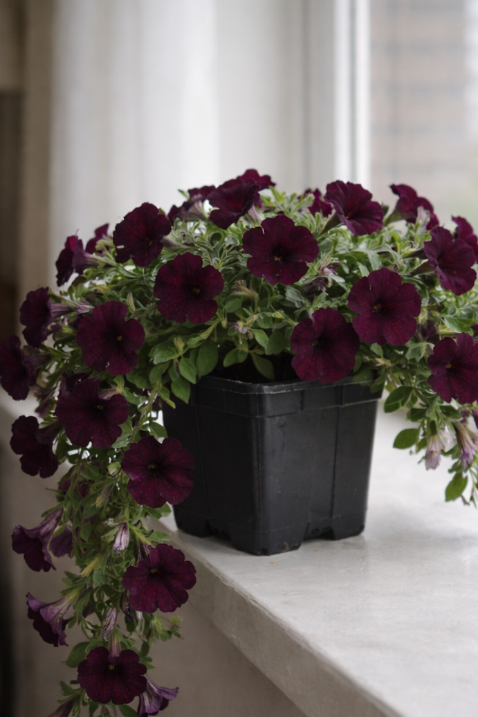 Каскадна петунія на підвіконні: охайний ріст і перші хвилі цвітіння.