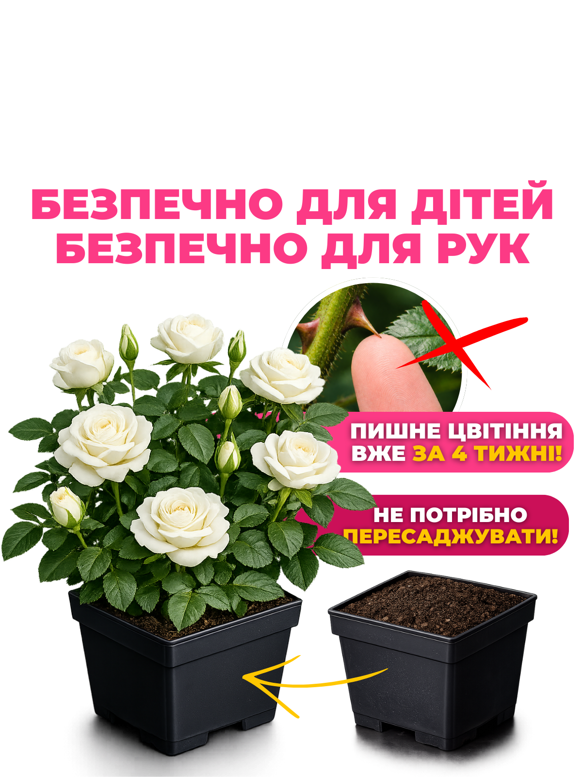 Ви бачите реальний шлях: від горщика з підживленим ґрунтом — до квітучої троянди без шипів.